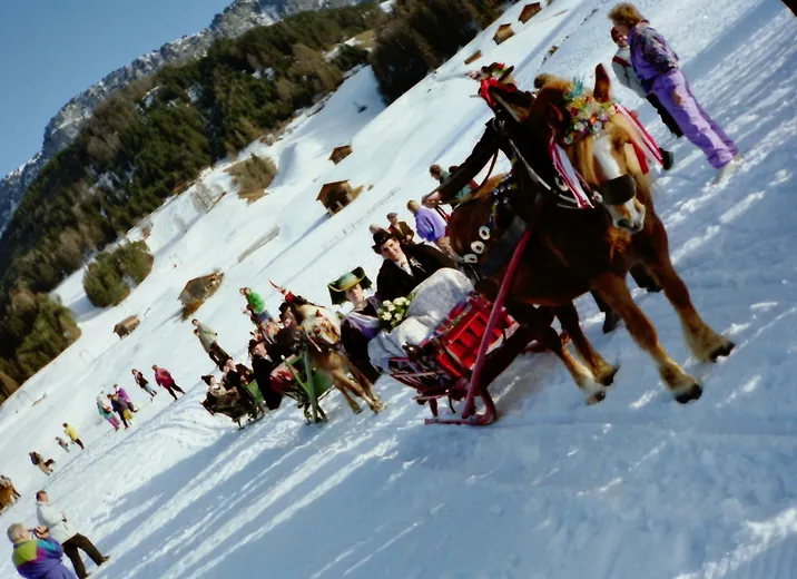 Dass man mit einem Rad auf Schnee nicht weiterkommt, das haben unsere Vorfahren sicherlich am eigenen Leib in einem fernen Winter erlebt. In Südtirol, wie auch in anderen Alpen- und Bergländern, war der Schlitten ein unverzichtbares Transportmittel beim Ausüben der schweren Arbeiten, so z.B. für den Transport von Heu von den Berghütten, wo es im Sommer eingelagert wurde, und für den Transport von Holz. Dafür wurden große, feste Schlitten benutzt, auch Hornschlitten genannt. Kleinere Schlitten oder Rodeln wurden für die Fortbewegung der Menschen benutzt. Es ist noch nicht so lange her, dass Kinder von entlegenen Bergbauernhöfen mit der Rodel zur Schule fuhren! Sicherlich fand auch da bereits das eine oder andere Rennen zwischen den Schülern statt…