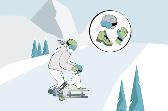 NIE mit Skischuhen rodeln: Skischuhe haben kein Profil und durch den hohen, steifen Schaft kann es im Schienbeinbereich leicht zu Brüchen kommen. Zudem geben sie keinen Halt beim Bremsen.