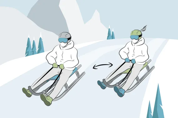 Den Oberkörper aufrichten und dabei den Rodelriemen in Richtung Brust ziehen, damit die Bremskraft erhöht wird. Gleichzeitig beide Schuhsohlen flach und fest auf den Boden drücken.