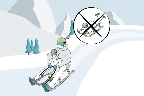 Dass man beim Rodeln auch beträchtliche Geschwindigkeiten erreichen kann, ist vielleicht nicht sehr bekannt. Deshalb sitzt man aufrecht auf der Rodel. Das Rodeln mit dem Kopf voraus heißt man Skeleton und wird nur von Profis im Eiskanal praktiziert. Also nichts für Freizeitrodler*innen. Wer zudem sein Kind mit auf die Rodel nimmt, sollte es immer vor sich auf die Rodel setzen. Dabei sollte das Kind seine Beine gespreizt über die Rodelholme nach außen heben.